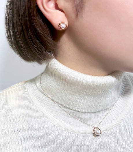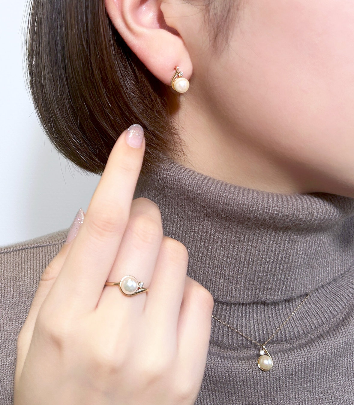 暗いトーンのお洋服には、イエローゴールドのパールジュエリーを