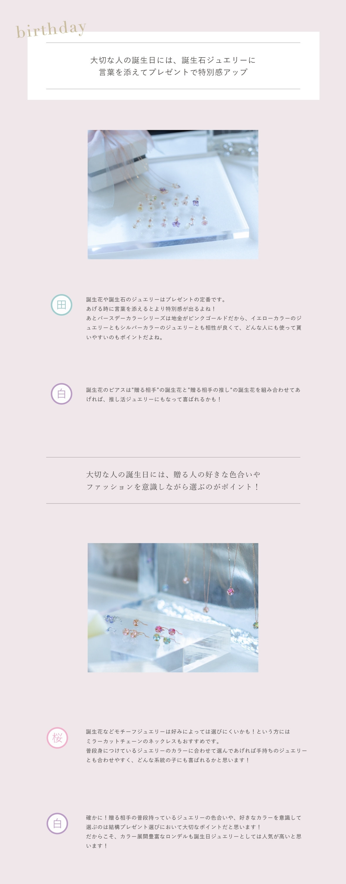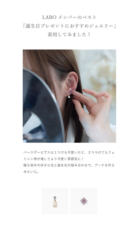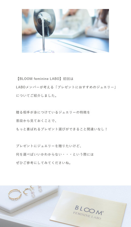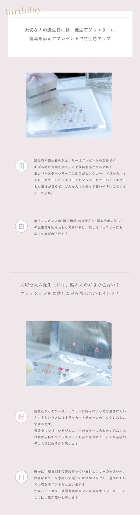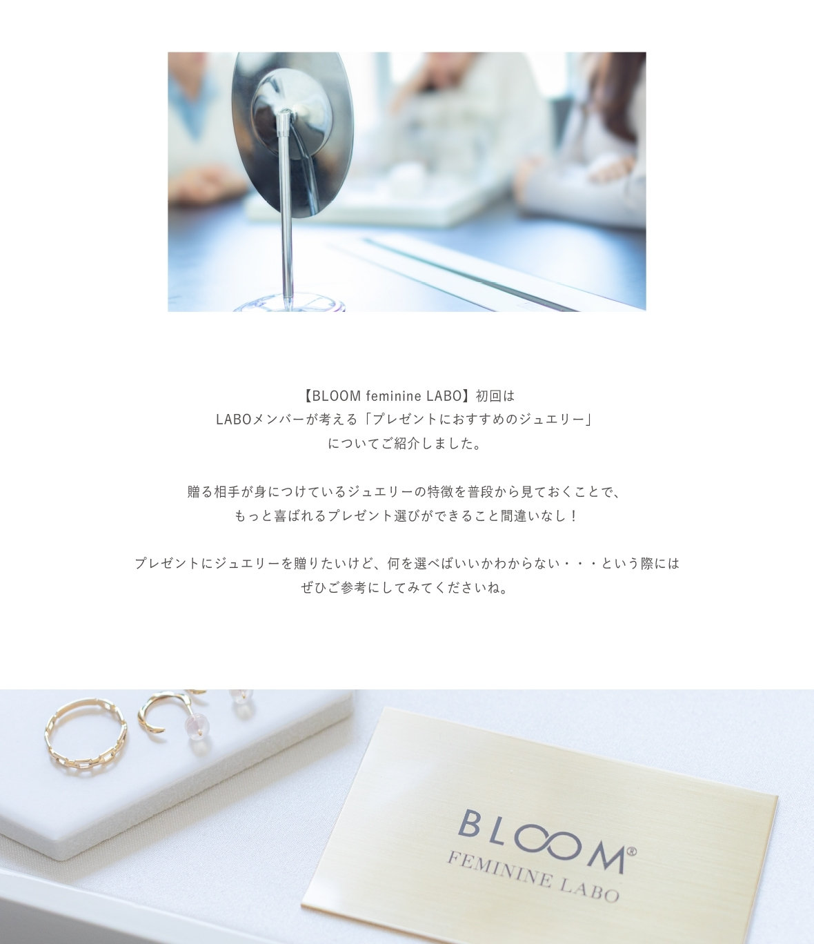 フェミニンをキーワードに、ジュエリーに関する皆さんのお悩みをBLOOMスタッフで座談会をしながら解決する【BLOOM feminine LABO】初回のテーマは「プレゼントにおすすめのジュエリー」友人や彼女、自分へのプレゼントにおすすめのジュエリーの選び方について、LABOメンバーに聞いてきました。 BLOOMラボ#1 プレゼントにおすすめのジュエリーは? BLOOM ブルーム 【Birth Flower】5月誕生花 K10 ピンクゴールド スズラン ピアス ※片耳用 ¥8,800 (税込) BLOOM ブルーム 【Birth Flower】6月誕生花 K10 ピンクゴールド アジサイ ピアス ※片耳用 ¥8,800 (税込) BLOOM ブルーム 【Birth Flower】5月誕生花 K10 ピンクゴールド スズラン ピアス ※片耳用 ¥8,800 (税込) BLOOM ブルーム 【Birth Flower】6月誕生花 K10 ピンクゴールド アジサイ ピアス ※片耳用 ¥8,800 (税込) 誕生花ピアス一覧はこちら BLOOM ブルーム 【Rondelle】K10 ピンクゴールド キュービックジルコニア ネックレス(from spring) ¥22,000 (税込) BLOOM ブルーム K18 ピンクゴールド ミラーカットチェーン ネックレス ¥49,500 (税込) BLOOM ブルーム 【Rondelle】K10 ピンクゴールド キュービックジルコニア ネックレス(from spring) ¥22,000 (税込) BLOOM ブルーム K18 ピンクゴールド ミラーカットチェーン ネックレス ¥49,500 (税込) ロンデルネックレス一覧はこちら ミラーカットチェーンネックレス一覧はこちら BLOOM ブルーム 11月誕生石 K10 イエローゴールド ホワイトトパーズ 馬蹄 ネックレス ¥16,500 (税込) ESTELLE エステール 11月誕生石 K10 イエローゴールド ホワイトトパーズ 馬蹄 ネックレス ¥14,300 (税込) BLOOM ブルーム 11月誕生石 K10 イエローゴールド ホワイトトパーズ 馬蹄 ネックレス ¥16,500 (税込) ESTELLE エステール 11月誕生石 K10 イエローゴールド ホワイトトパーズ 馬蹄 ネックレス ¥14,300 (税込) 馬蹄ネックレス一覧はこちら 特集一覧ページに戻る 特集一覧ページに戻る TOPページに戻る TOPページに戻る