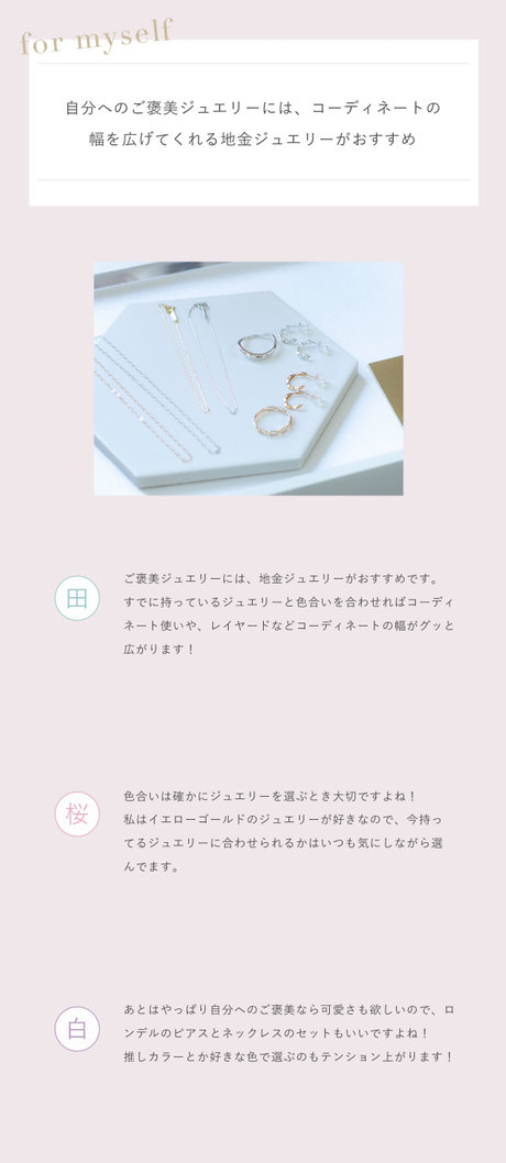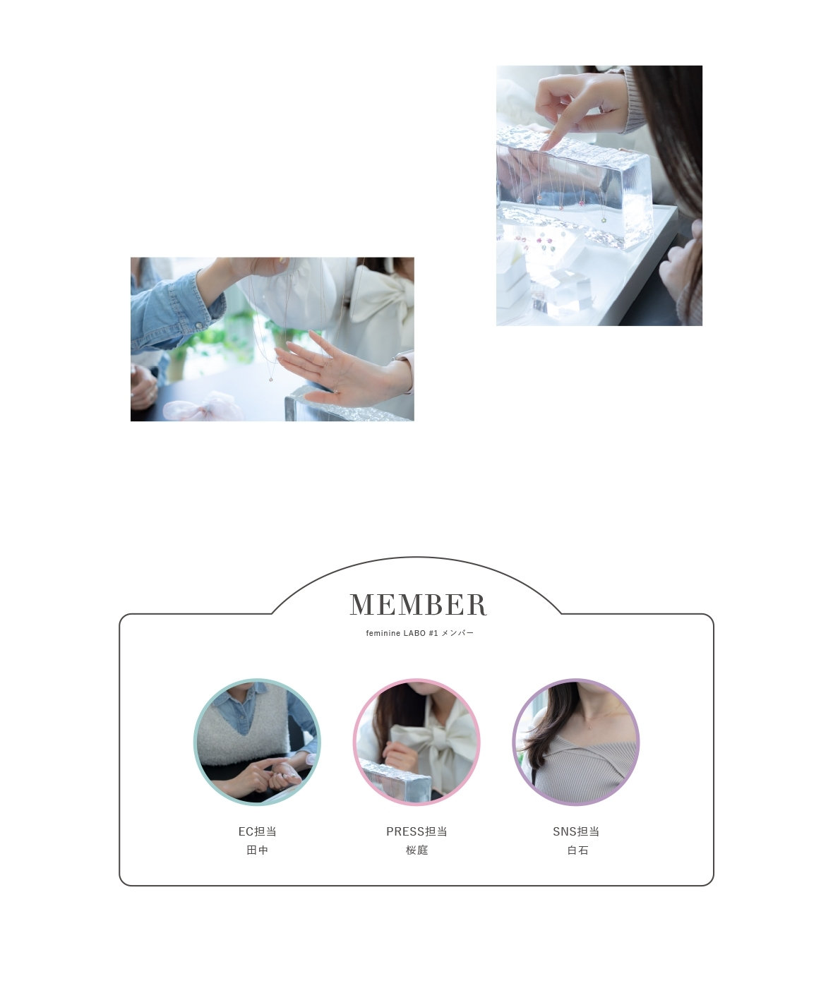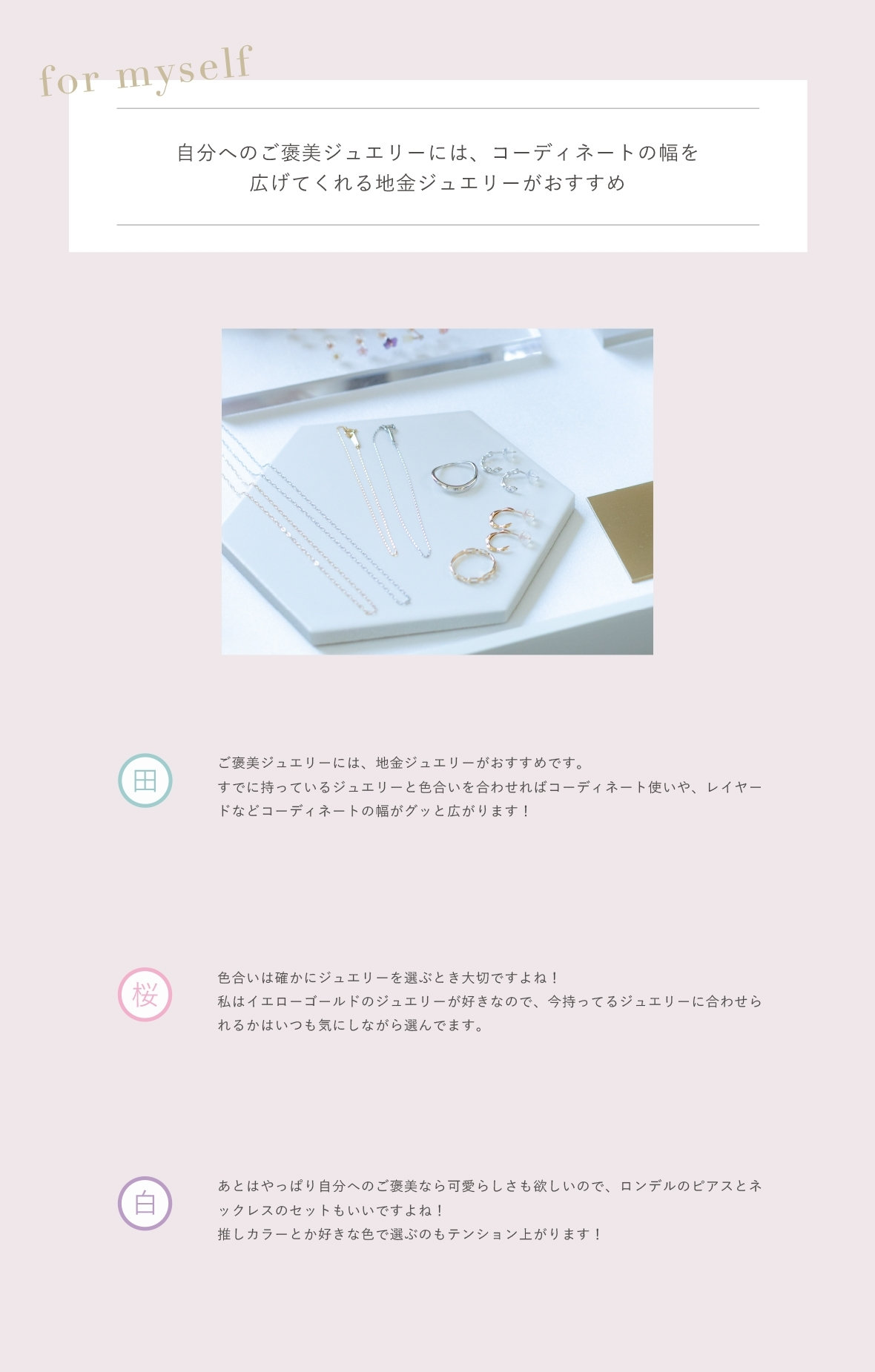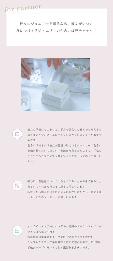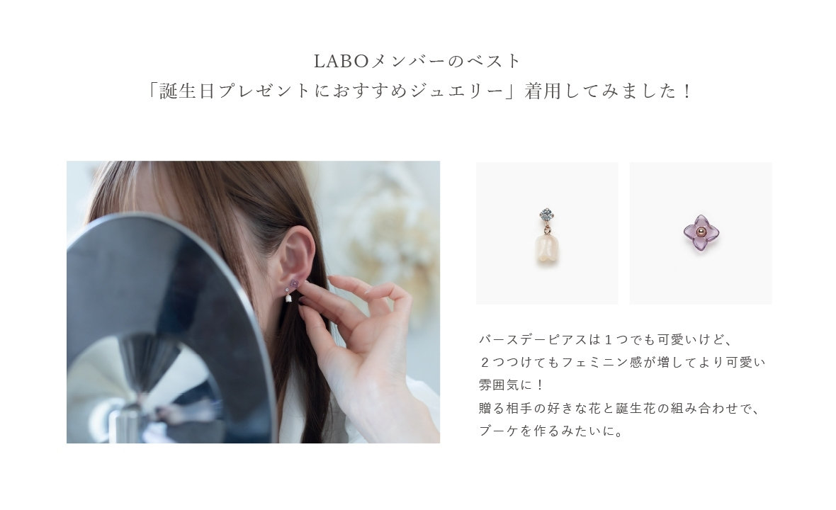 フェミニンをキーワードに、ジュエリーに関する皆さんのお悩みをBLOOMスタッフで座談会をしながら解決する【BLOOM feminine LABO】初回のテーマは「プレゼントにおすすめのジュエリー」友人や彼女、自分へのプレゼントにおすすめのジュエリーの選び方について、LABOメンバーに聞いてきました。 BLOOMラボ#1 プレゼントにおすすめのジュエリーは? BLOOM ブルーム 【Birth Flower】5月誕生花 K10 ピンクゴールド スズラン ピアス ※片耳用 ¥8,800 (税込) BLOOM ブルーム 【Birth Flower】6月誕生花 K10 ピンクゴールド アジサイ ピアス ※片耳用 ¥8,800 (税込) BLOOM ブルーム 【Birth Flower】5月誕生花 K10 ピンクゴールド スズラン ピアス ※片耳用 ¥8,800 (税込) BLOOM ブルーム 【Birth Flower】6月誕生花 K10 ピンクゴールド アジサイ ピアス ※片耳用 ¥8,800 (税込) 誕生花ピアス一覧はこちら BLOOM ブルーム 【Rondelle】K10 ピンクゴールド キュービックジルコニア ネックレス(from spring) ¥22,000 (税込) BLOOM ブルーム K18 ピンクゴールド ミラーカットチェーン ネックレス ¥49,500 (税込) BLOOM ブルーム 【Rondelle】K10 ピンクゴールド キュービックジルコニア ネックレス(from spring) ¥22,000 (税込) BLOOM ブルーム K18 ピンクゴールド ミラーカットチェーン ネックレス ¥49,500 (税込) ロンデルネックレス一覧はこちら ミラーカットチェーンネックレス一覧はこちら BLOOM ブルーム 11月誕生石 K10 イエローゴールド ホワイトトパーズ 馬蹄 ネックレス ¥16,500 (税込) ESTELLE エステール 11月誕生石 K10 イエローゴールド ホワイトトパーズ 馬蹄 ネックレス ¥14,300 (税込) BLOOM ブルーム 11月誕生石 K10 イエローゴールド ホワイトトパーズ 馬蹄 ネックレス ¥16,500 (税込) ESTELLE エステール 11月誕生石 K10 イエローゴールド ホワイトトパーズ 馬蹄 ネックレス ¥14,300 (税込) 馬蹄ネックレス一覧はこちら 特集一覧ページに戻る 特集一覧ページに戻る TOPページに戻る TOPページに戻る