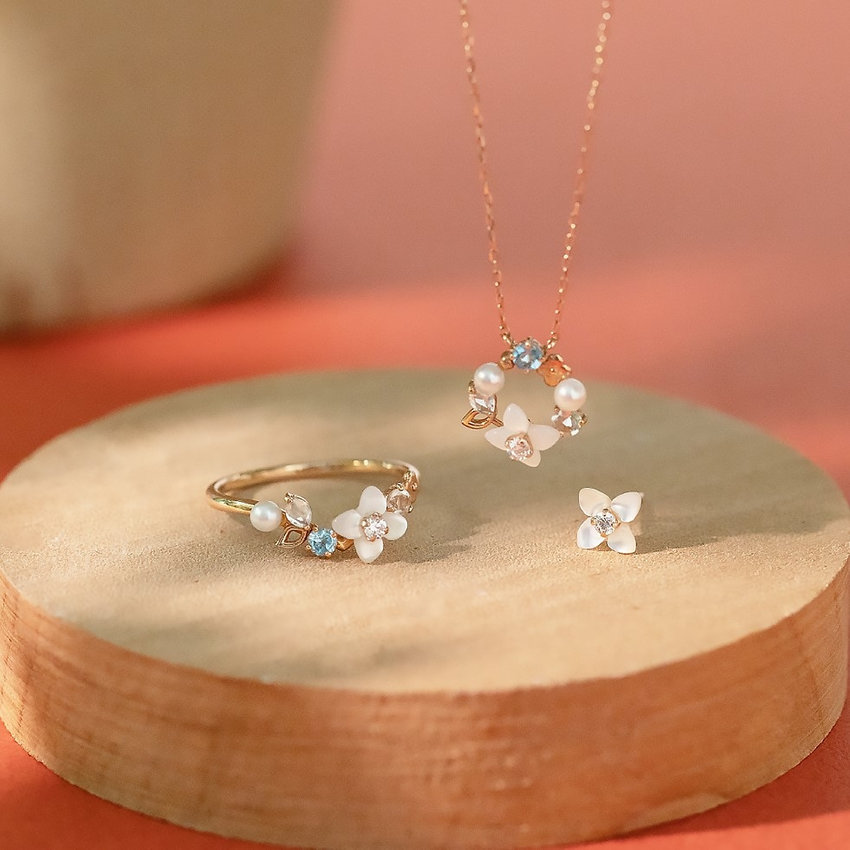 誕生花(バースフラワー)をモチーフにした愛らしいデザインのジュエリー。