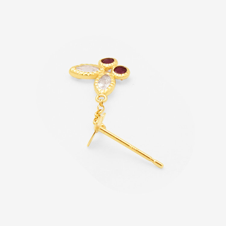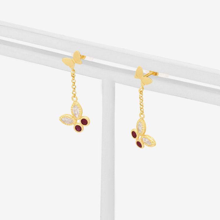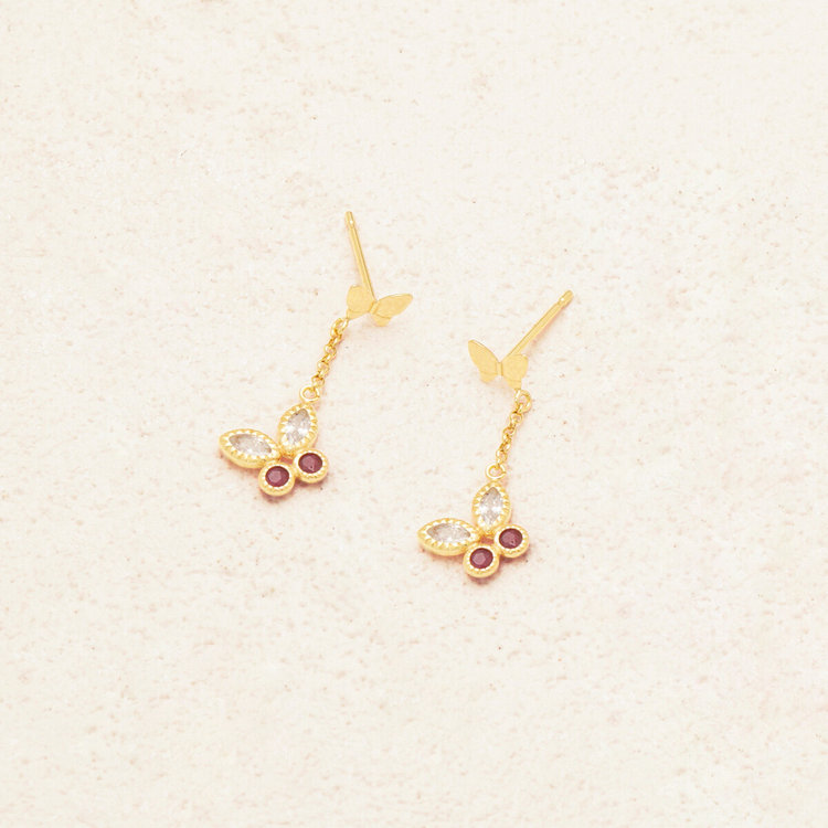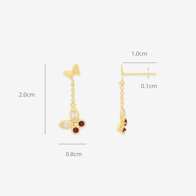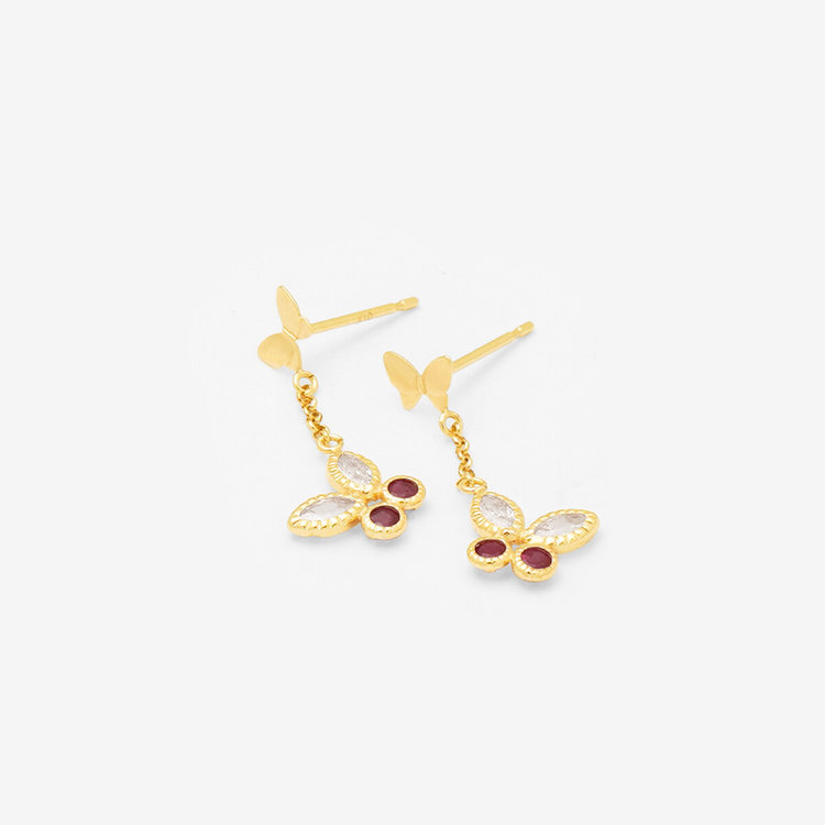 気持ちをポジティブにしてくれるバタフライのシルエットとルビーが品の良さを引き立てます。揺れるデザインは優雅に女性らしく耳元を美しく彩ります。