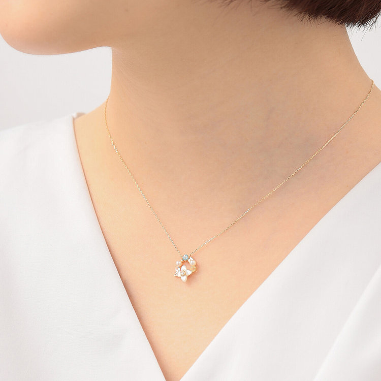 天然石やシェルを散りばめたサークルモチーフは、まるで甘く香り立つブーケのよう。
