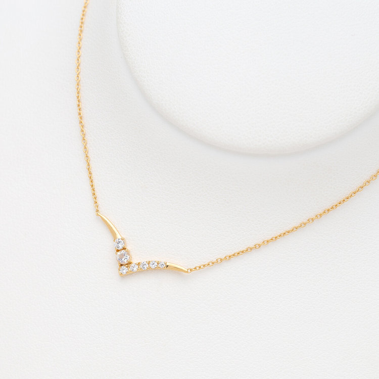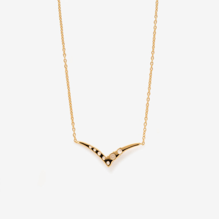 ムーンストーンのイエローゴールドネックレスは、さりげなく光を反射してデコルテを美しく飾り上品な雰囲気が漂います。