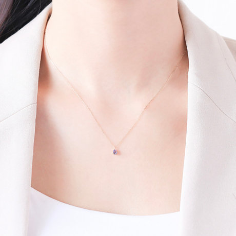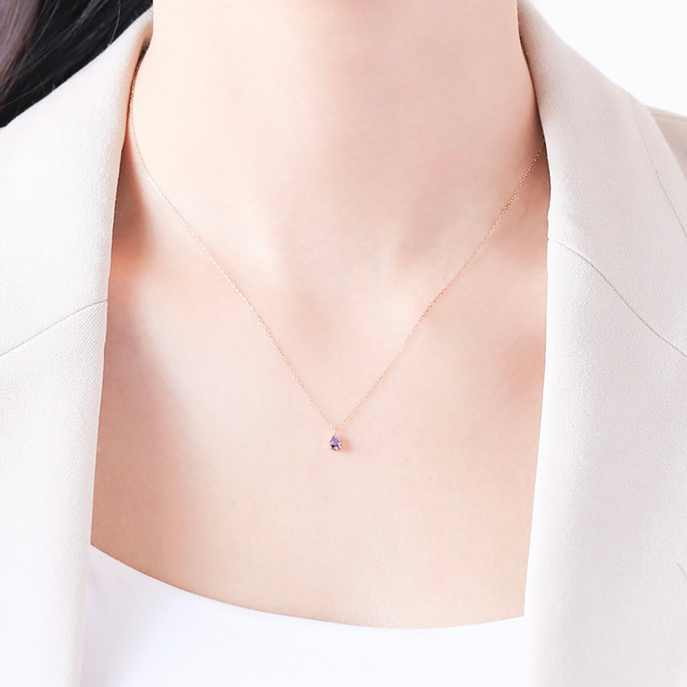 ミニマルなペアシェイプストーンの美しいバイオレットブルーのタンザナイトに施された細かいカットが繊細に輝き、華奢なチェーンがデコルテで煌めき肌に溶け込みます。