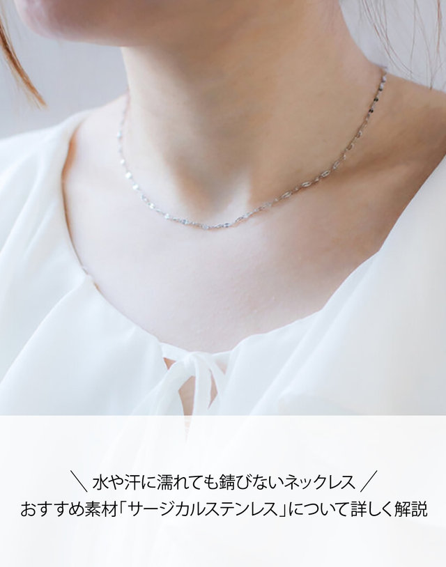 「サージカルステンレス」は汗や水にも強いため、汗をかきやすい夏にもつけやすく季節問わずネックレスをつけることができるでしょう。