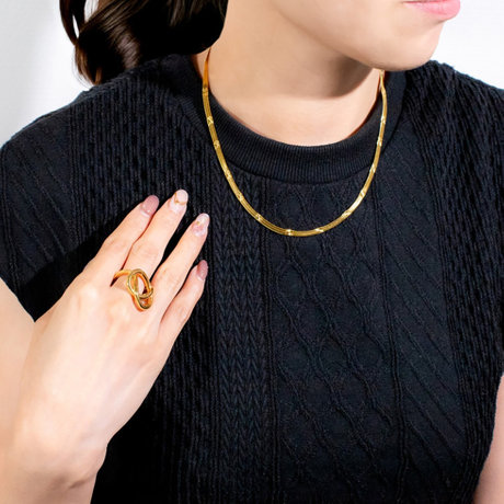 シンプルなチェーンネックレスはスタイリングをバランスよく引き締め 、モードでこなれた雰囲気を与えてくれる頼もしい存在です。