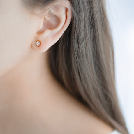 シンプルな6本爪の一粒ダイヤモンドピアスは、シーンやコーディネートを選ばず、ピンクゴールドと合わせることで柔らかな色合いになり、優しくフェミニンな印象に。
