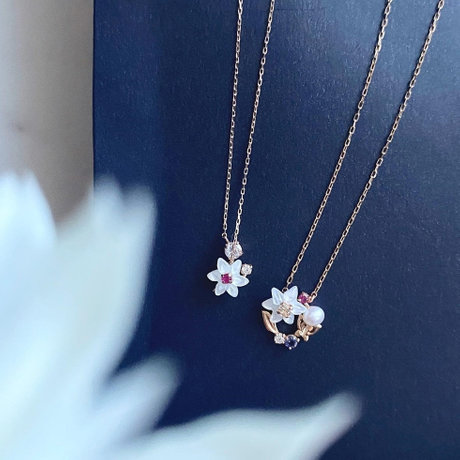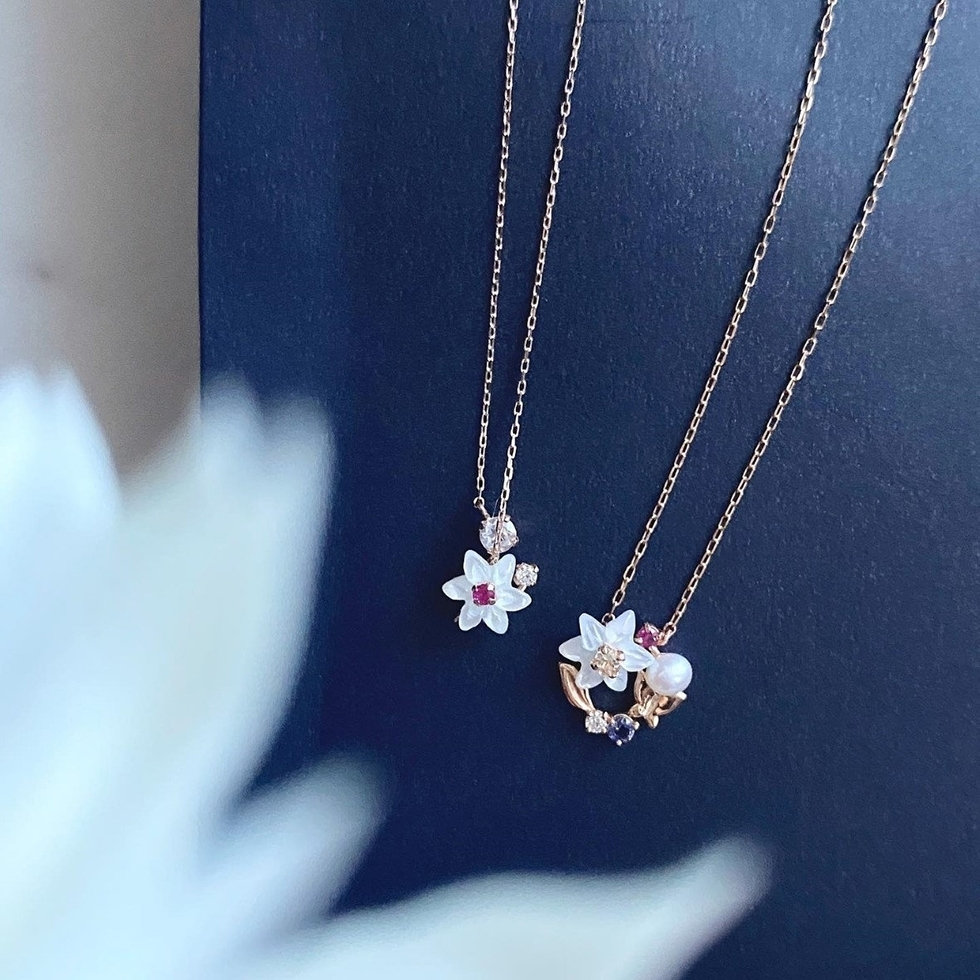天然石やシェルを使ったネックレスは誕生石が寄り添う誕生花の繊細なジュエリーです。