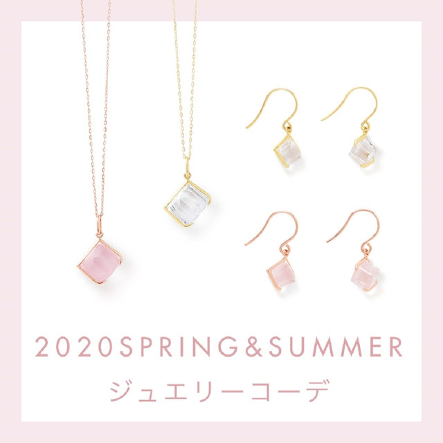 春コーデに映える涼しげなホワイトクォーツのアイテム。琥珀糖のような立体的なカットのクォーツは、コーデにきらめきと透明感をプラスしてくれます。色違いでフェミニンなローズクォーツのアイテムもございます。